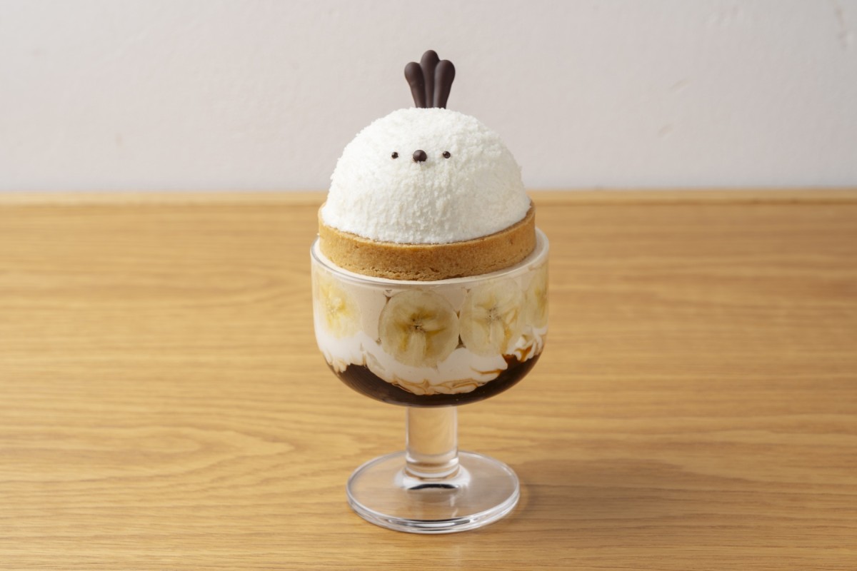 雪の妖精シマエナガのケーキを期間限定のパフェにあしらいました。月替わりのパフェとシマエナガをお楽しみください。