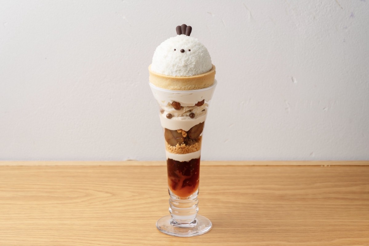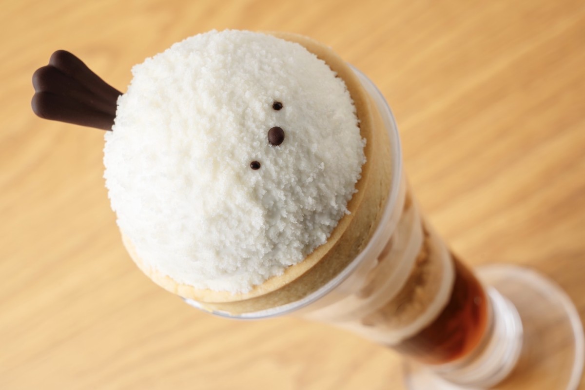雪の妖精シマエナガのケーキを期間限定のパフェにあしらいました。月替わりのパフェとシマエナガをお楽しみください。