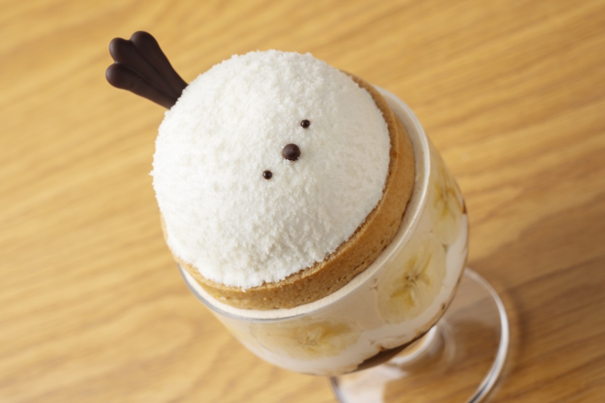 雪の妖精シマエナガのケーキを期間限定のパフェにあしらいました。月替わりのパフェとシマエナガをお楽しみください。